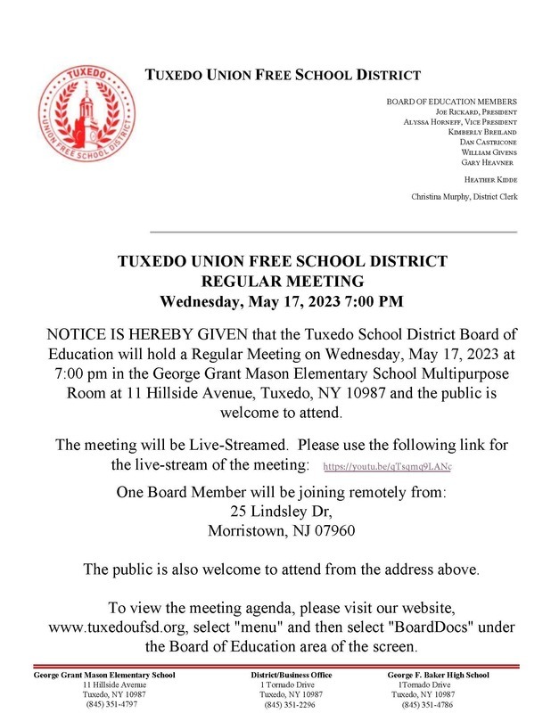 Please see the UPDATED meeting announcement for the Regular Board of Education Meeting on Wednesday, May 17. The link for the meeting can be found below the notice