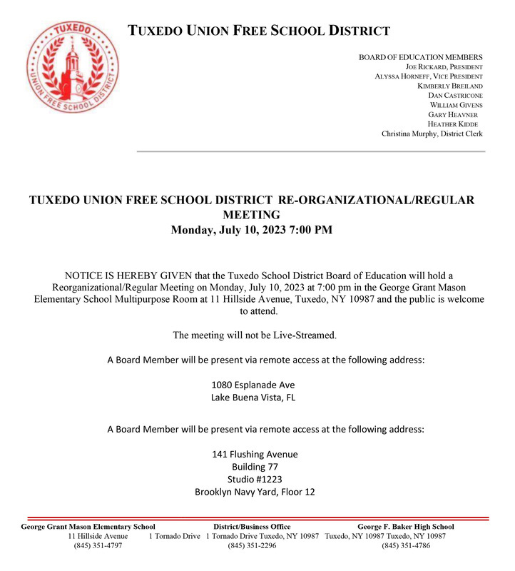 Please see the updated Reorganizational meeting announcement for the Board of Education on Monday, July 10, 2023 at 7 PM ET. (Reflects update to a board members location)