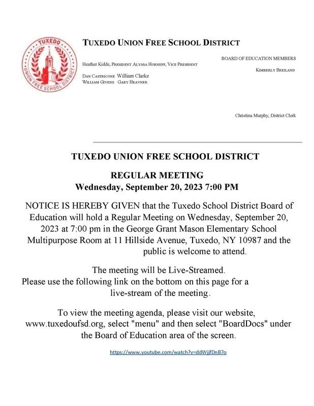 Please see the below meeting announcement for the Regular Board of Education Meeting on Wednesday, September 20.