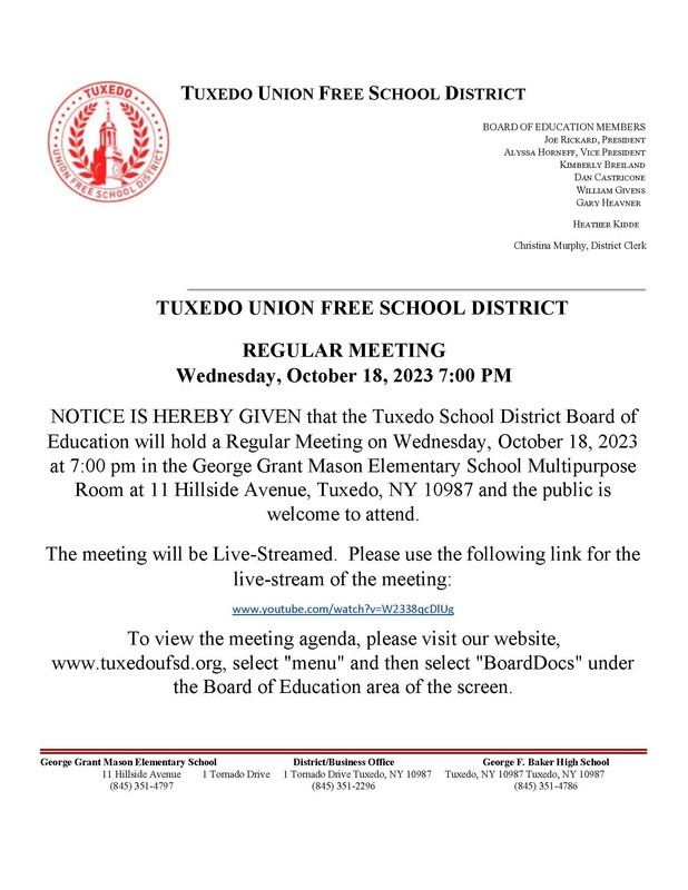 Please see the below meeting announcement for the Regular Board of Education Meeting on Wednesday, October 18.