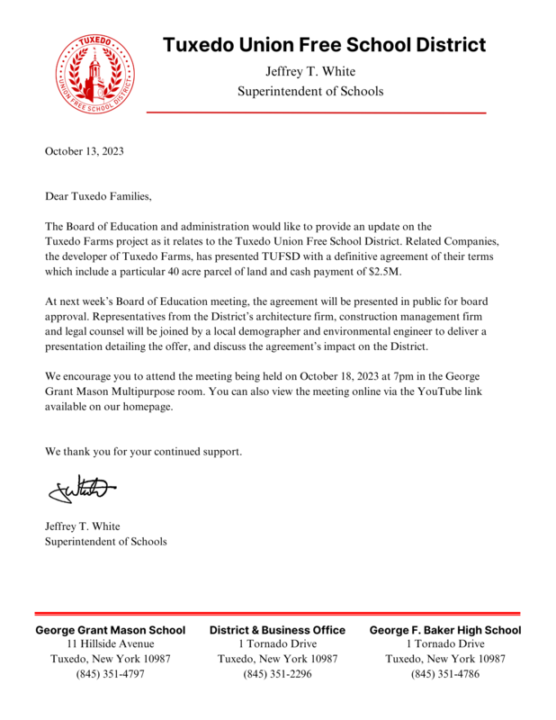 Please see the letter below from Superintendent Jeff White regarding the Board of Education meeting that is scheduled to take place on October 18.