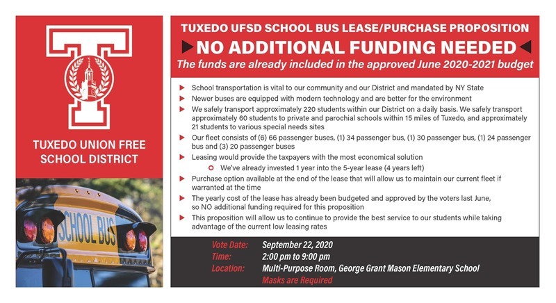 Shall the Board of Education of the Tuxedo Union Free School District be authorized to enter into a lease-purchase agreement and any financing associated therewith, in accordance with General Municipal Law §109-b, to lease-purchase Four (4) 66- Passenger Buses, Two (2) 66-Passenger Buses with Luggage Compartment, One (1) 34-Passenger Bus, One (1) 30-Passenger Bus,One (1) 24-Passenger Wheelchair Bus, and Three (3) 22-Passenger Buses for a maximum estimated amount of $672,200, at a cost of $168,050 per for four (4) years, commencing in the 2020-2021 school year, and to levy and collect a tax in an amount not to exceed $168,050 per year to meet such obligation, with the purchase option at the end of the lease term in the amount of $261,500.
