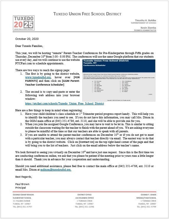 Parent-Teacher Conference sign-up is underway. Please check out the images of the letters sent for GGM and GFB for information. You may copy and paste the following link to your web browser to begin signing up: https://ptcfast.com/schools/Tu...