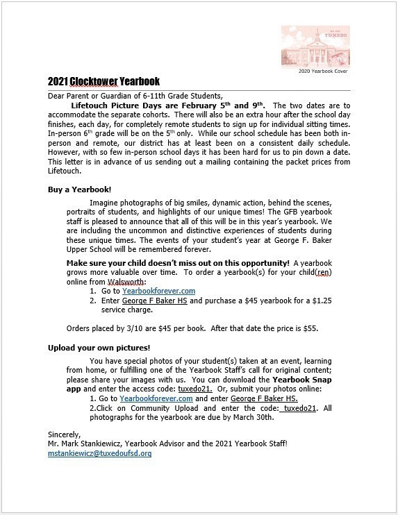 5. For students who are 100% remote and would like to have their picture taken, appointments can be made to bring your child in between 3pm and 4pm on either February 5th or 9th. There will be a separate photographer in both GGM and GFB. You may sign up for the same time if you have students in both schools. Please contact Mr. Takeuchi to set up an appointment at mtakeuchi@tuxedoufsd.org