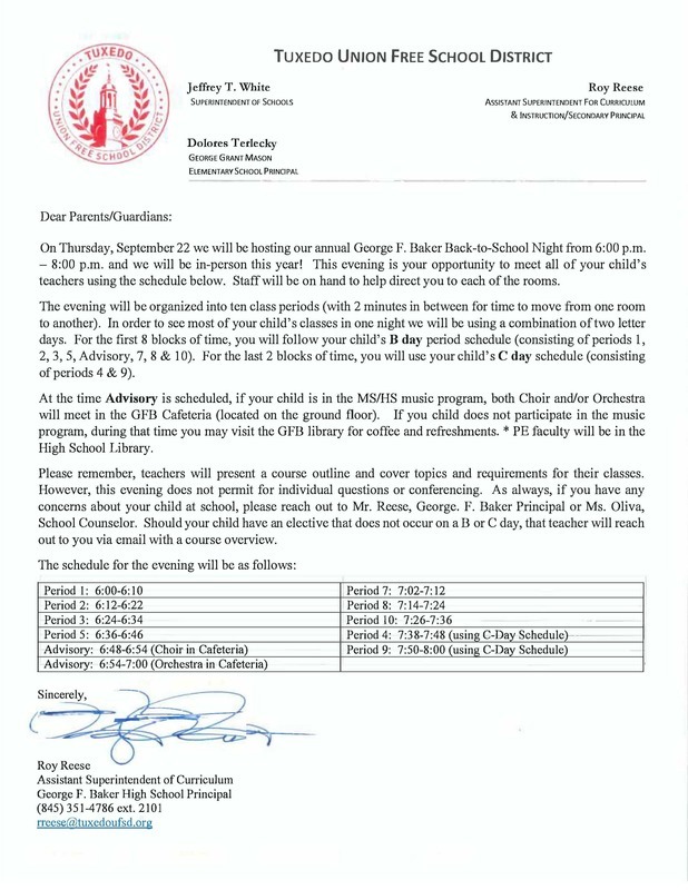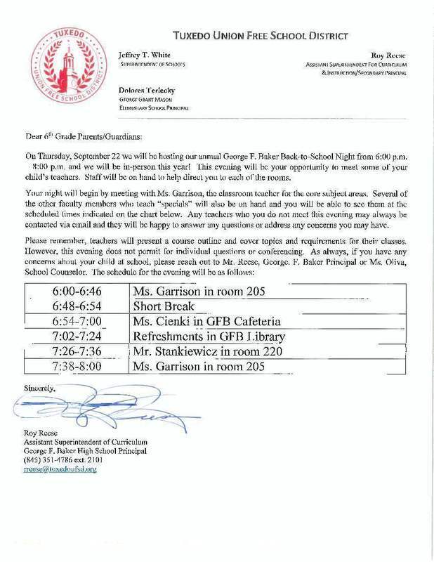 Reminder for #TuxedoUFSD High School parents! George F. Baker #backtoschool night is Thursday, September 22, 6-8 PM. The schedules for grade 6 and grades 7-12 can be found below.