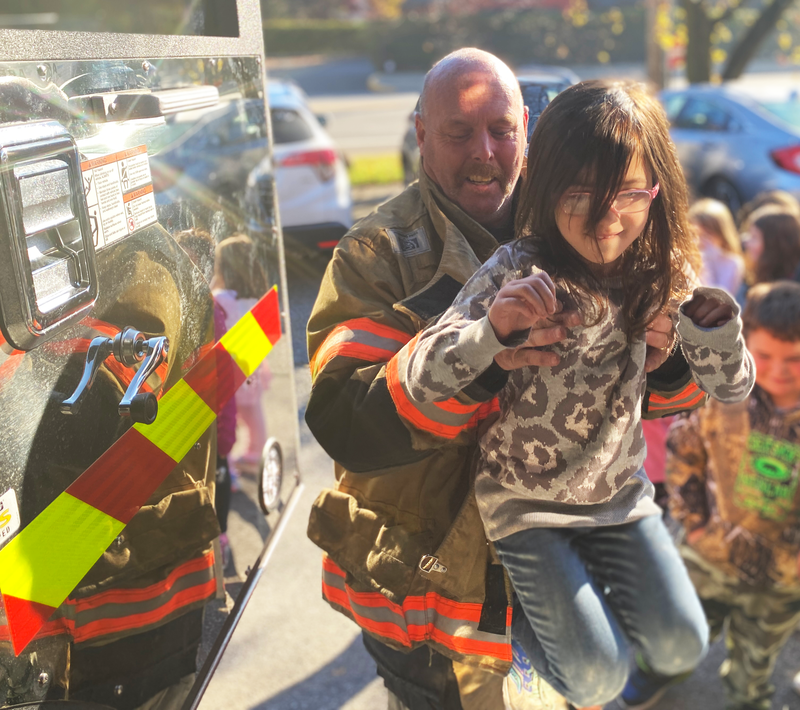 👨🚒 Rattazzi then stepped into his uniform and led everyone outside to tour the fire truck! With the truck’s ladder stretched out to the roof of GGM, students lined up to learn about the many compartments in the truck and examine the apparatus that lay inside. Tuxedo’s youngest citizens are strong, but they needed a little extra muscle to lift the large fire extinguisher (which, contains water not foam or powder). Already garbed in his heavy fire gear and bathed in sunlight, Rattazzi added one more layer as everyone looked on; his oxygen tanks and mask. Ratazzi said he wanted the children to see what a male or female fire fighter looks like in full gear, so they wouldn’t be scared in case of a real emergency.
