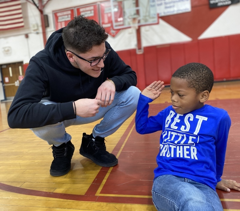 Twice a week, mentors in the peer tutoring program make the trip across Tornado Drive to help out Coaches Brunner and Dowling during Pre-K and Kindergarten PE Classes. From the moment they descend the stairs into the John P. Mottola gymnasium, loud shrieks and screams of joy echo across the room and bounce off the bleachers. Once the class gets underway, our older students jump right into the day’s activities, which could include dancing, skipping, high fives; whatever is required to keep students motivated and on their best behavior.