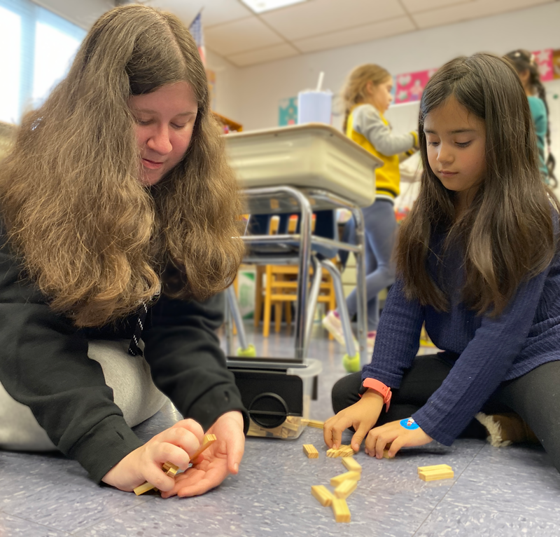 Outside of the gym is where you can find students taking part in the STEM Capstone Internship program. On one particular Friday afternoon this month, Senior Grace Donnelly assisted second grade teacher Ms. Blume for a late day STEM activity, patiently building a wooden train with her assigned partner. Downstairs and across the hall, Senior Anastasia Vishnevskaya lends a hand each week in Mrs. Rush’s Kindergarten class, assisting students with their work and play.